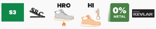 Sans métal, cette chaussure associe un embout composite et une semelle anti-perforation textile, apportant légèreté et souplesse lors des déplacements. Les coutures Kevlar ignifuges et la semelle résistante à la chaleur jusqu’à 300 °C pendant une minute garantissent une utilisation adaptée aux milieux à température extrêmement élevée.