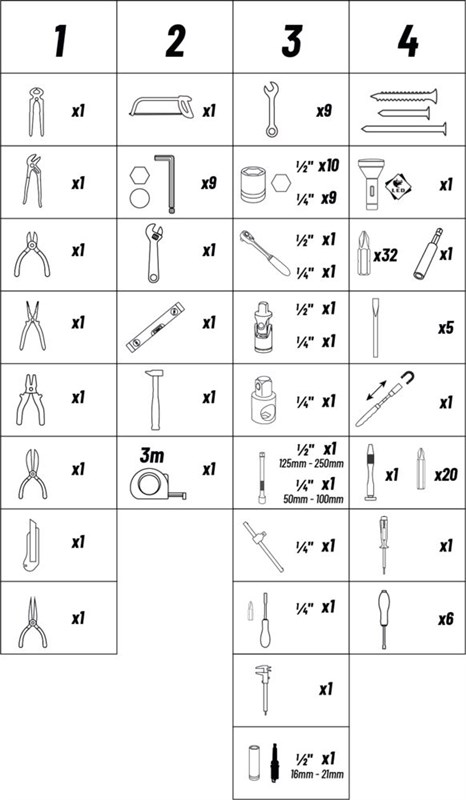 Avec ses cliquets 1/4" et 1/2" 72 dents, ses nombreuses douilles, clés mixtes et pinces, ainsi qu’un large assortiment d’embouts et accessoires, elle vous accompagne dans toutes vos interventions.